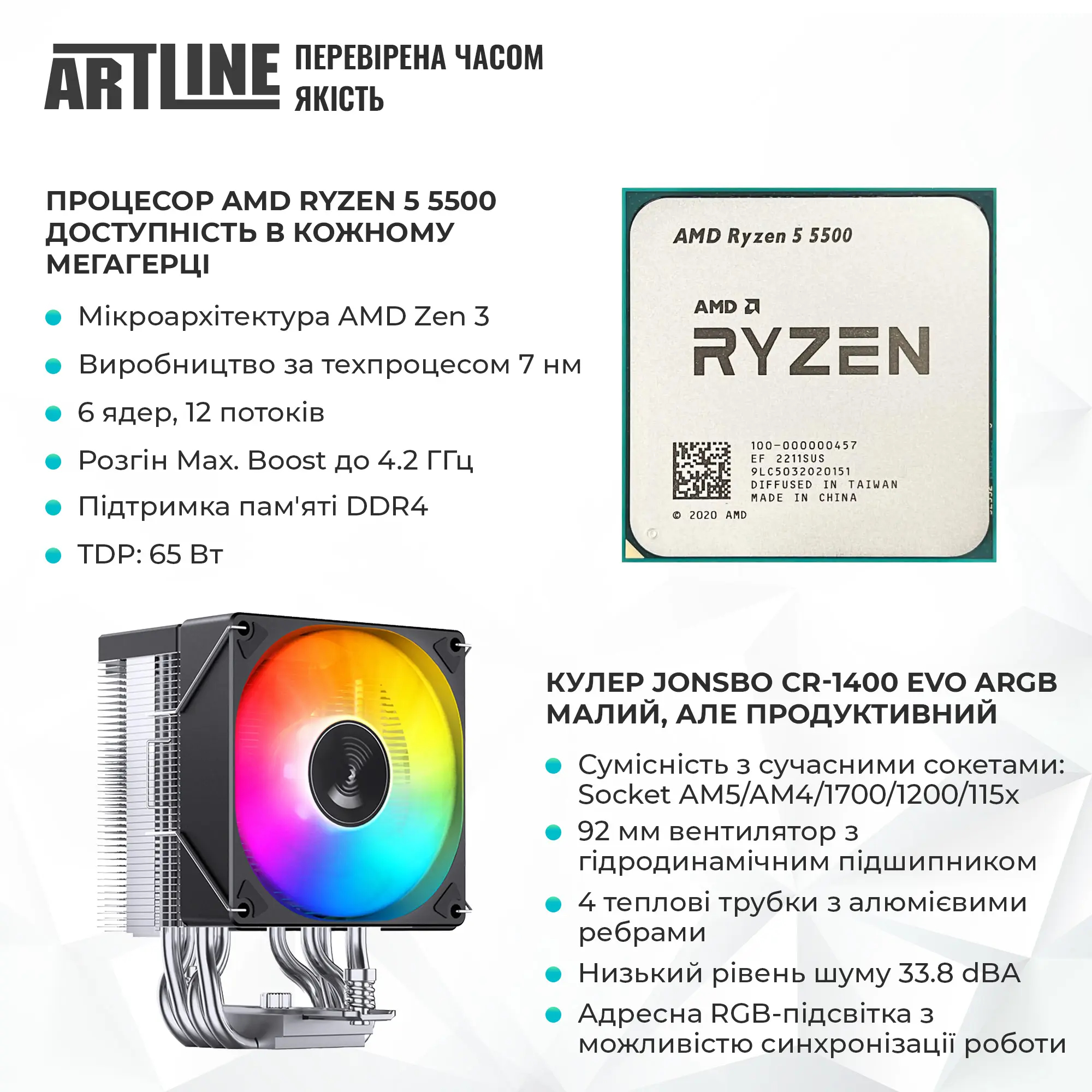 У ролі процесора виступає AMD Ryzen 5 5500 з 6 ядрами, 12 потоками та частотою до 4.2 ГГц на ядро. Створений на 7-нм техпроцесі, цей чіп має гарну продуктивність. Його вдале співвідношення ціни і якості робить його найбільш відповідним варіантом у цій збірці.