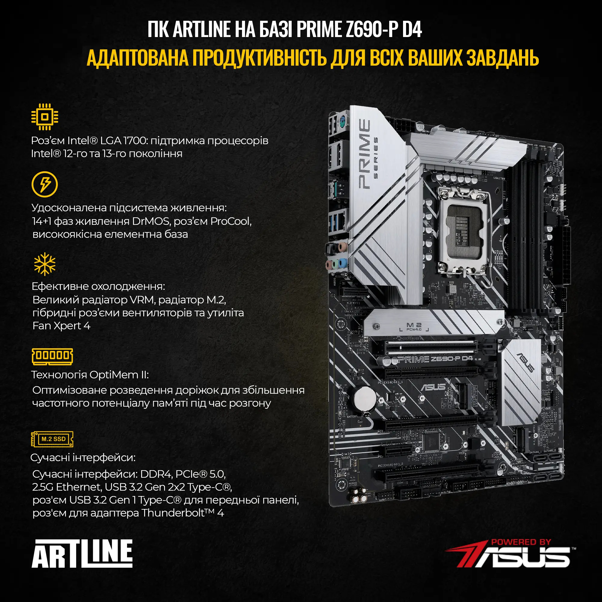 Материнська плата PRIME Z690-P D4 – це вершина технологій. Ця плата має все, що потрібно для максимально швидкої роботи комп'ютера. Вона забезпечує високу швидкість передавання даних між компонентами, що дає вам можливість отримати максимальну продуктивність у будь-якому завданні.