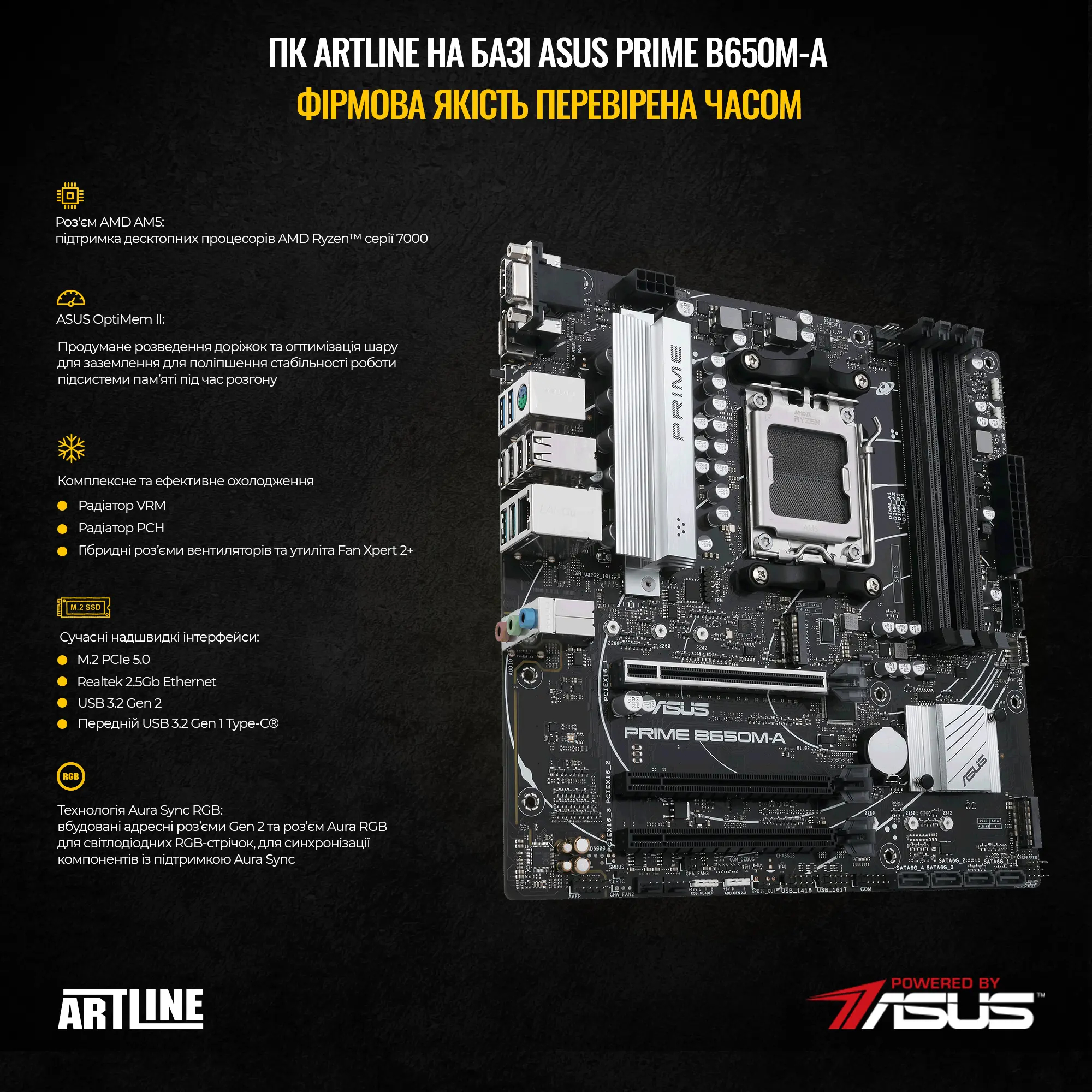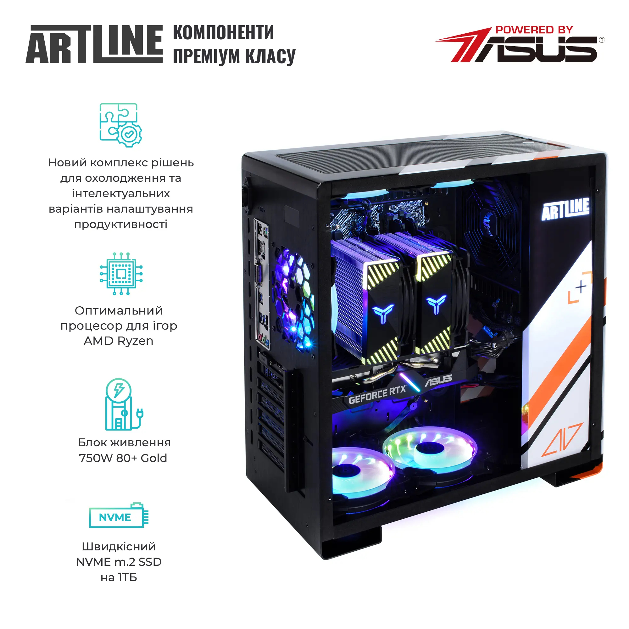 Материнська плата PRIME B650M-A, корпус QUBE GRIFFIN Custom і блок живлення 750W 80+ Gold - усе це компоненти, що працюють разом, щоб забезпечити максимальну продуктивність і поліпшене охолодження.