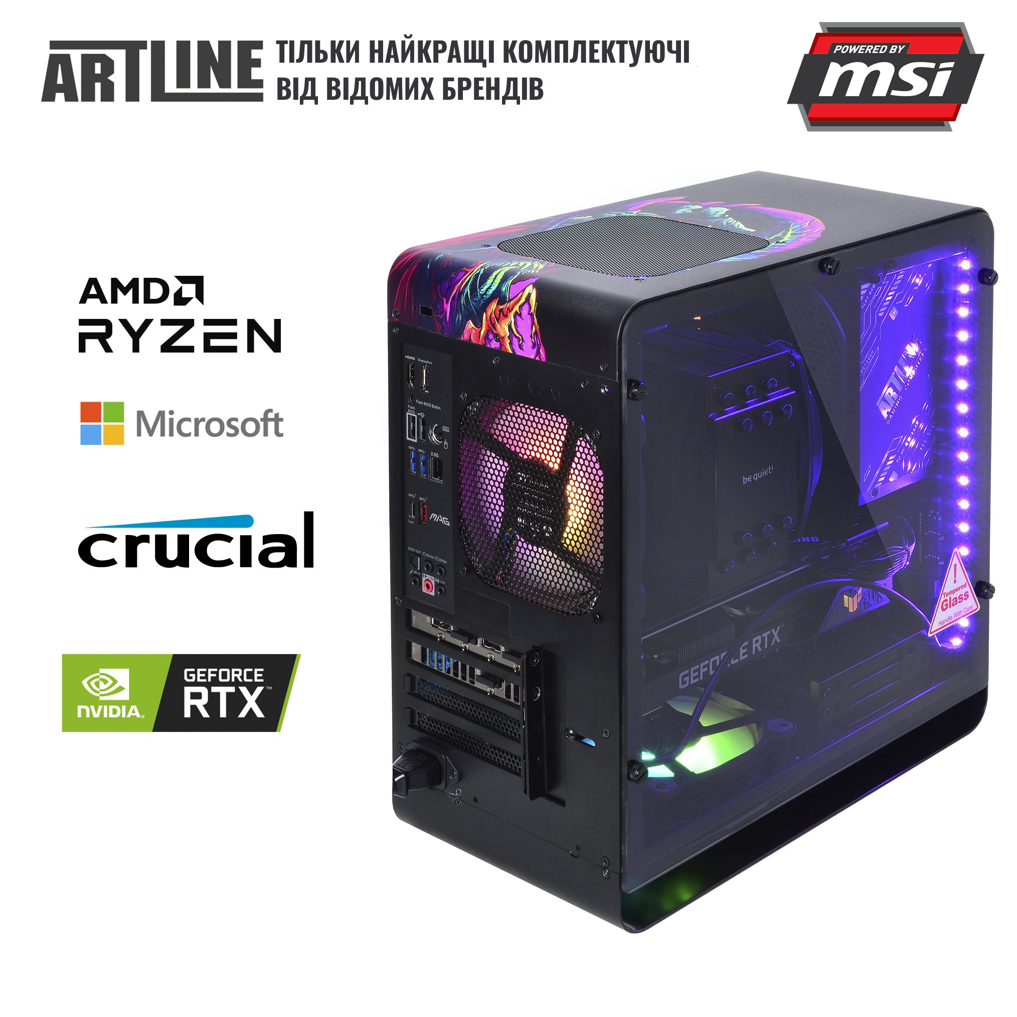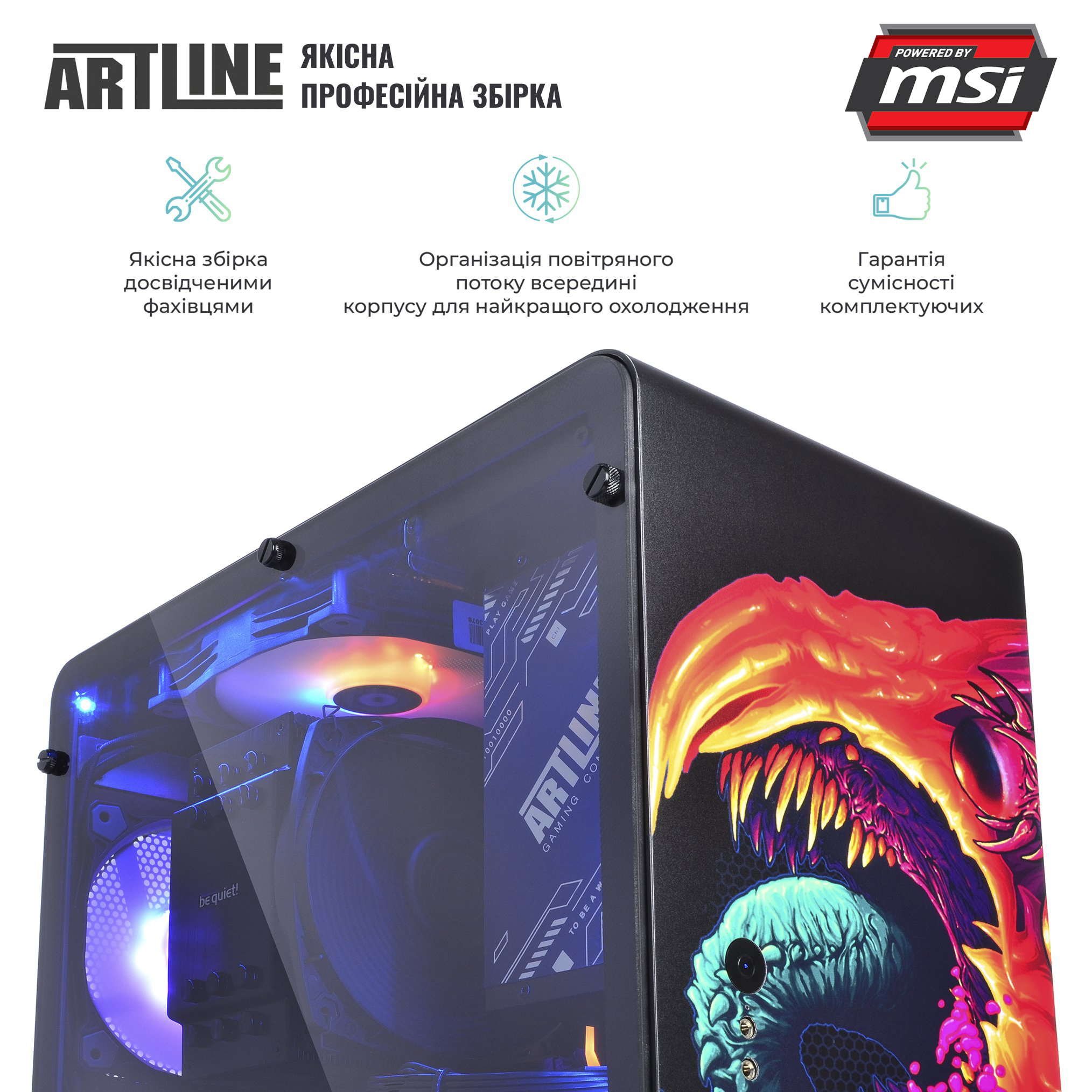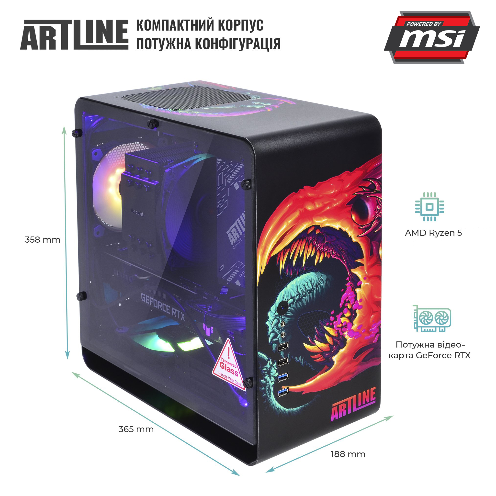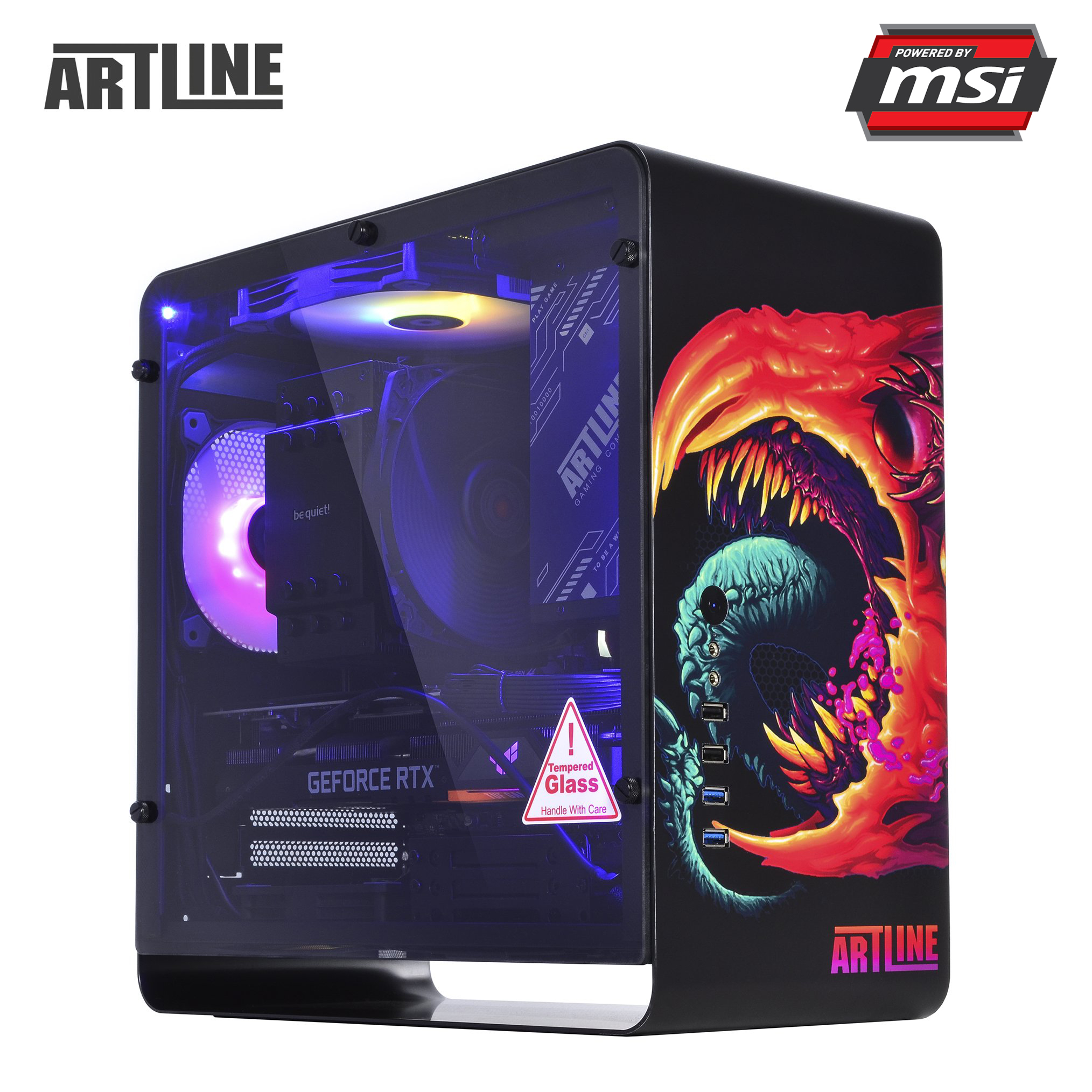 Всі комплектуючі ARTLINE DRAGONv35CH розміщені в стильному корпусі QUBE EAGLE з блоком живлення на 750 Вт сертифікації 80+ Gold і комплектом світлодіодних RGB-вентиляторів. Алюмінієвий корпус з боковою панеллю із загартованого скла і унікальним дизайном не залишать байдужим жодного геймера.