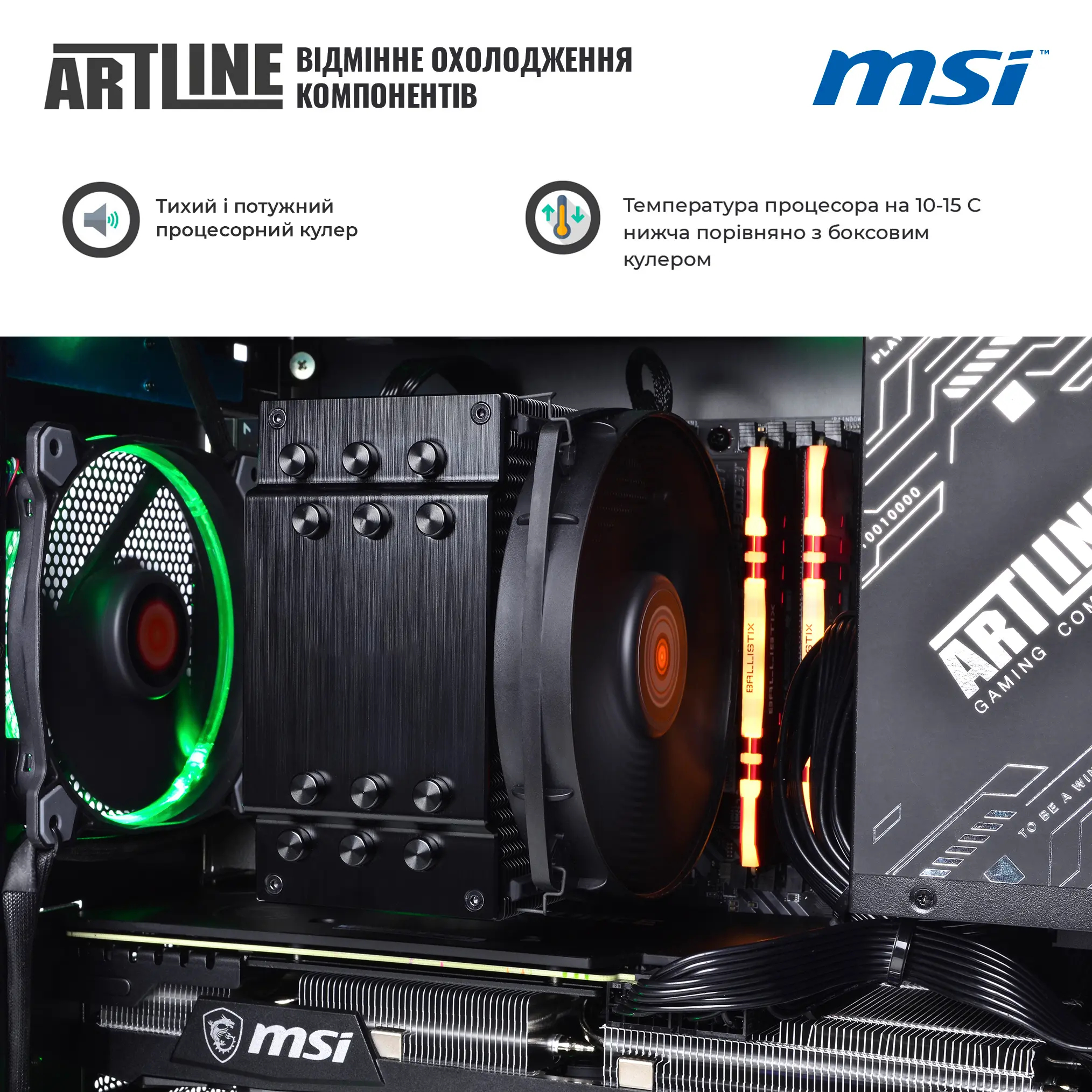 Оперативна пам'ять складає 16 ГБ DDR4-3200 Gaming, що дозволяє легко обробляти багатозадачність та запускати ресурсомісткі програми. Вашим файлам та даним забезпечений швидкий доступ завдяки об'ємному 1 ТБ накопичувача NVMe SSD.