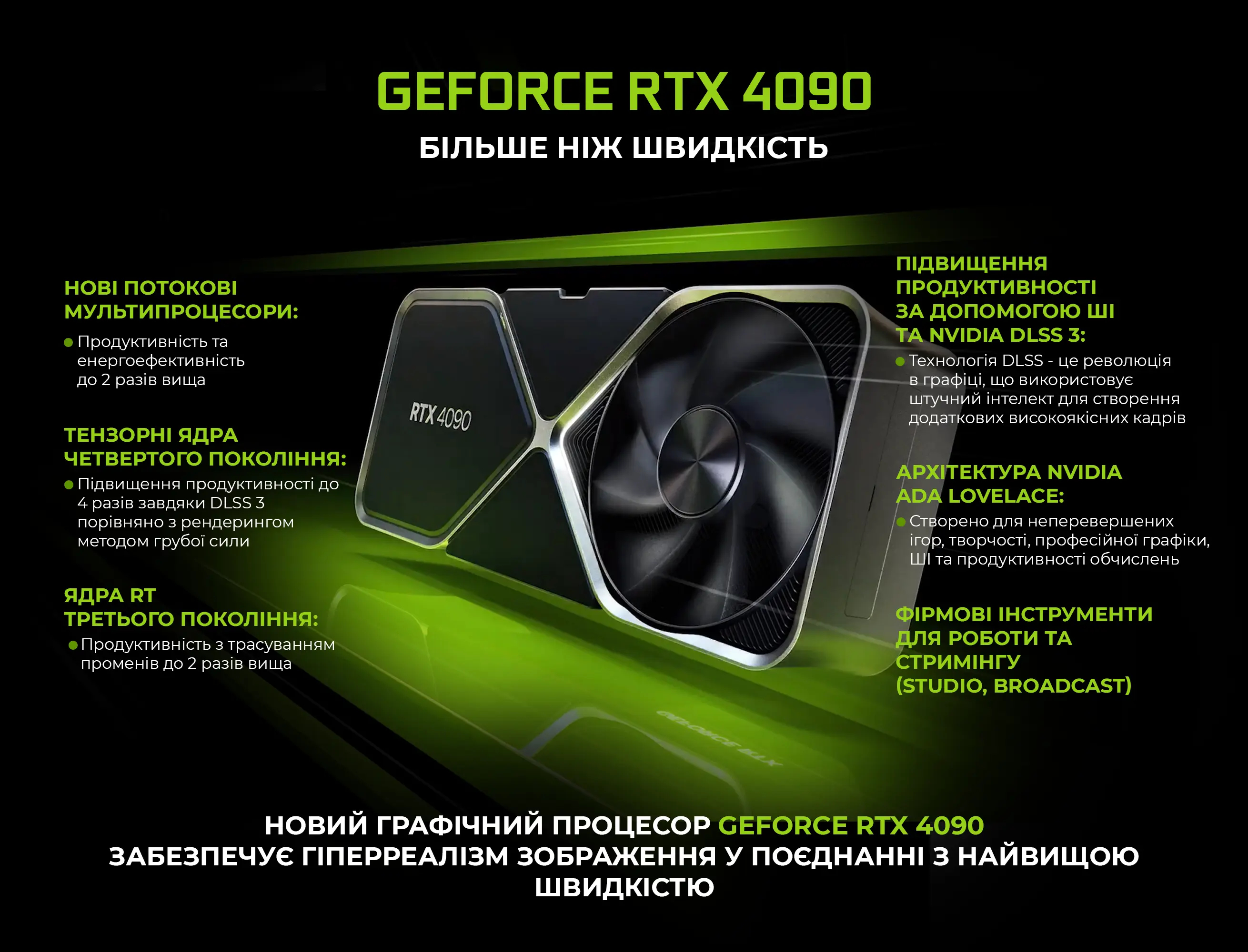 Відеокарта GeForce RTX 4090 гарантує захоплюючу графіку та неймовірне візуальне занурення. Завдяки своїй потужності та високій продуктивності, вона дозволяє запускати найсучасніші ігри на максимальних настройках та насолоджуватися захоплюючою деталізацією та реалістичністю.