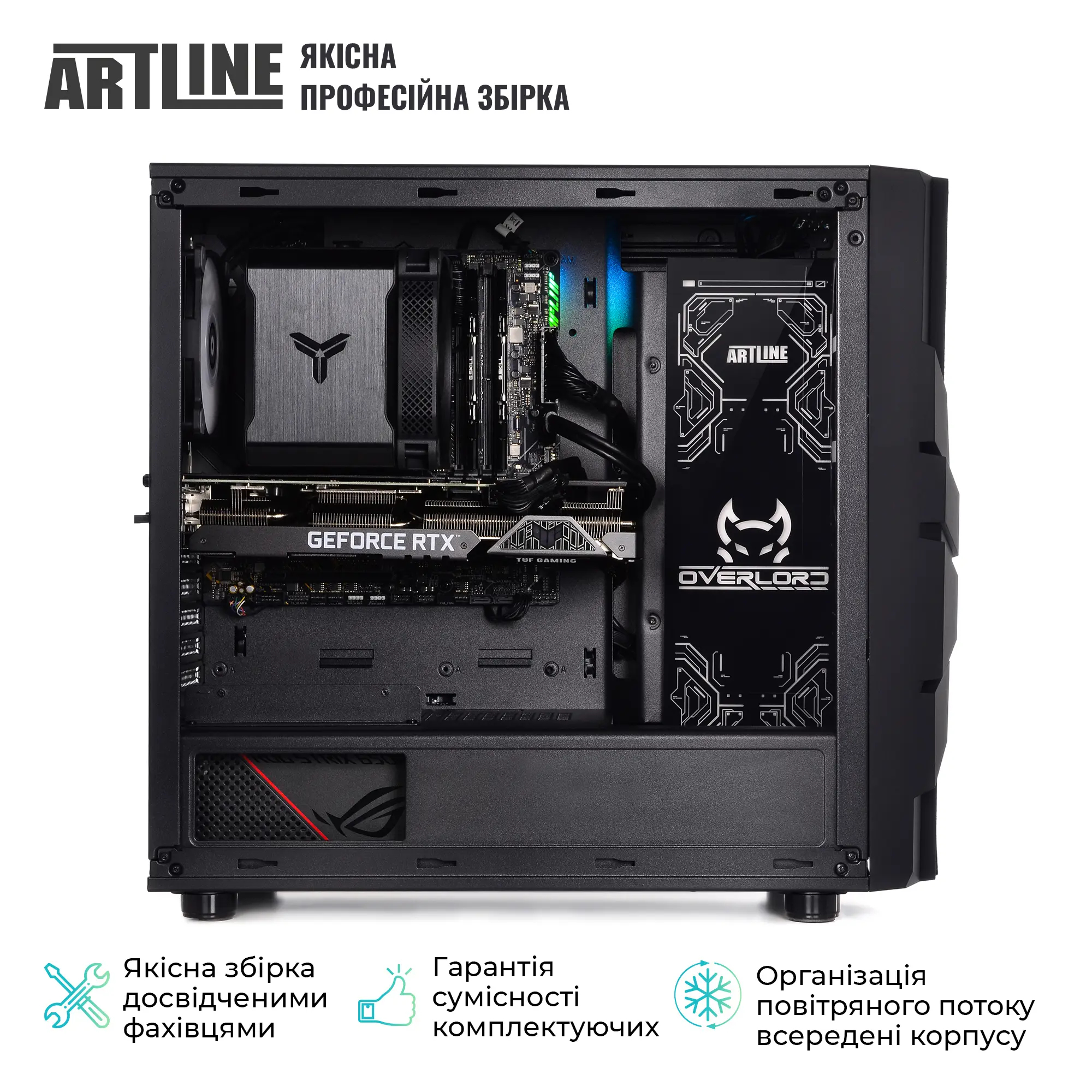 Комп'ютер ARTLINE Overlord X55v45 укомплектований блоком живлення STRIX 650W 80+ Gold, що гарантує стабільне та ефективне живлення всієї системи. Пиловий фільтр на верхній панелі та вентилятори з RGB підсвічуванням забезпечують не тільки додатковий захист від пилу, але й чудовий дизайн, який підкреслить вашу індивідуальність. Загартоване скло 4мм на бічній панелі додатково посилює захист системи та надає комп'ютеру більш сучасного вигляду.