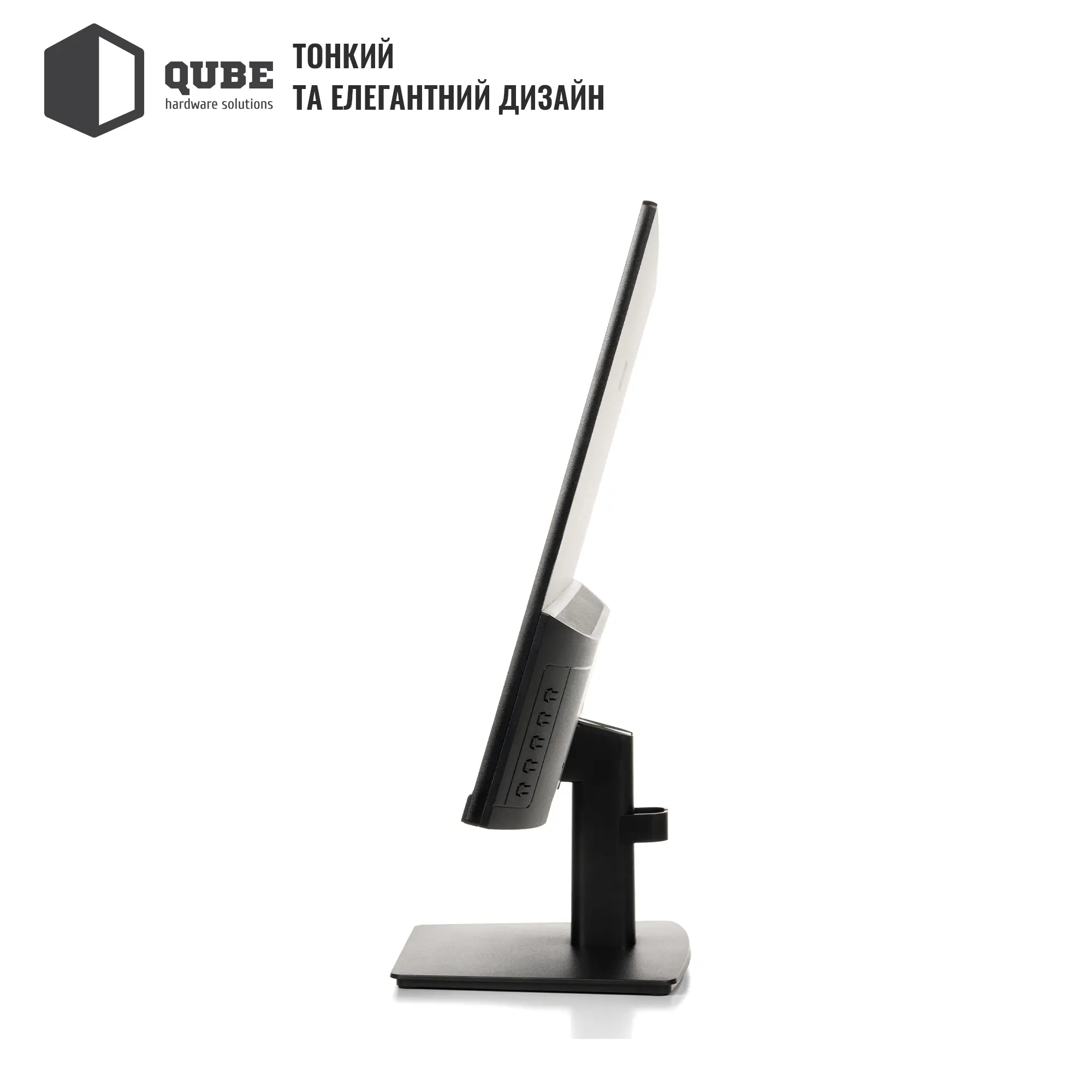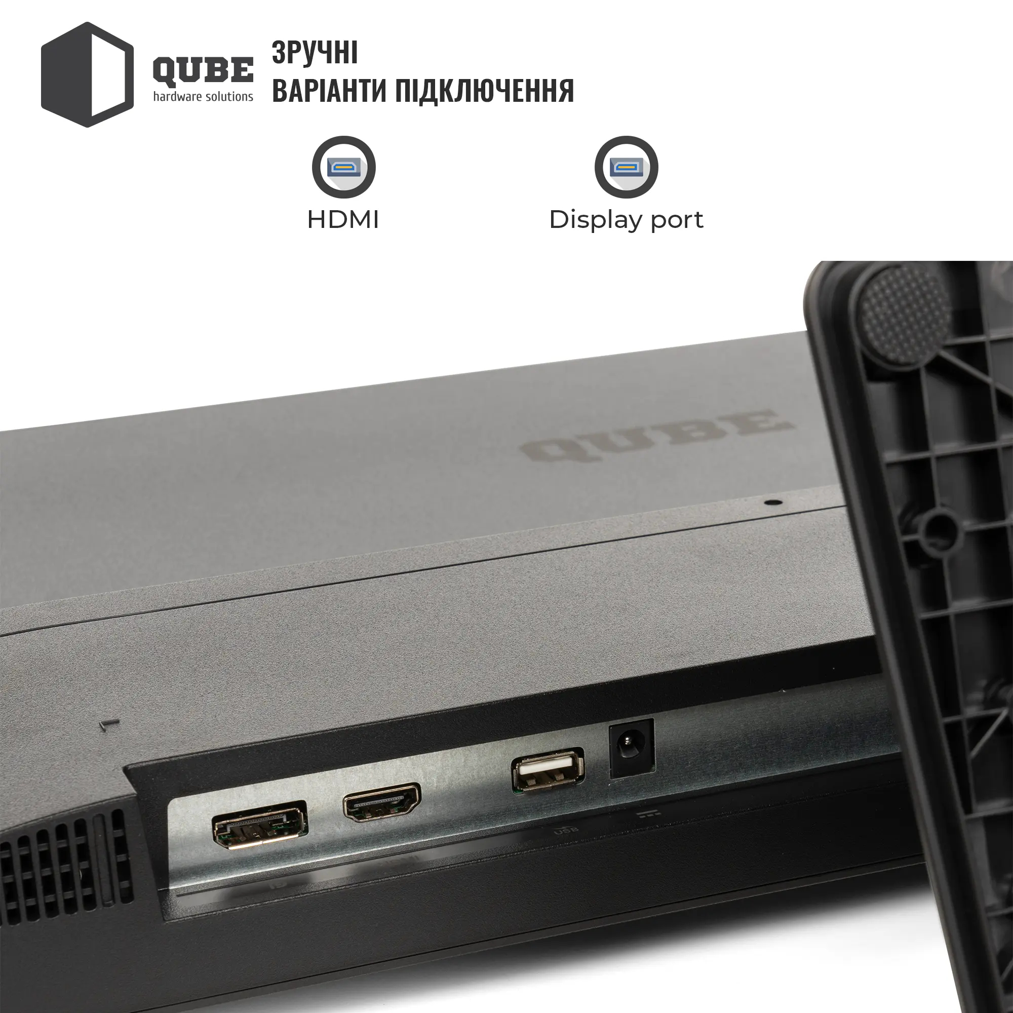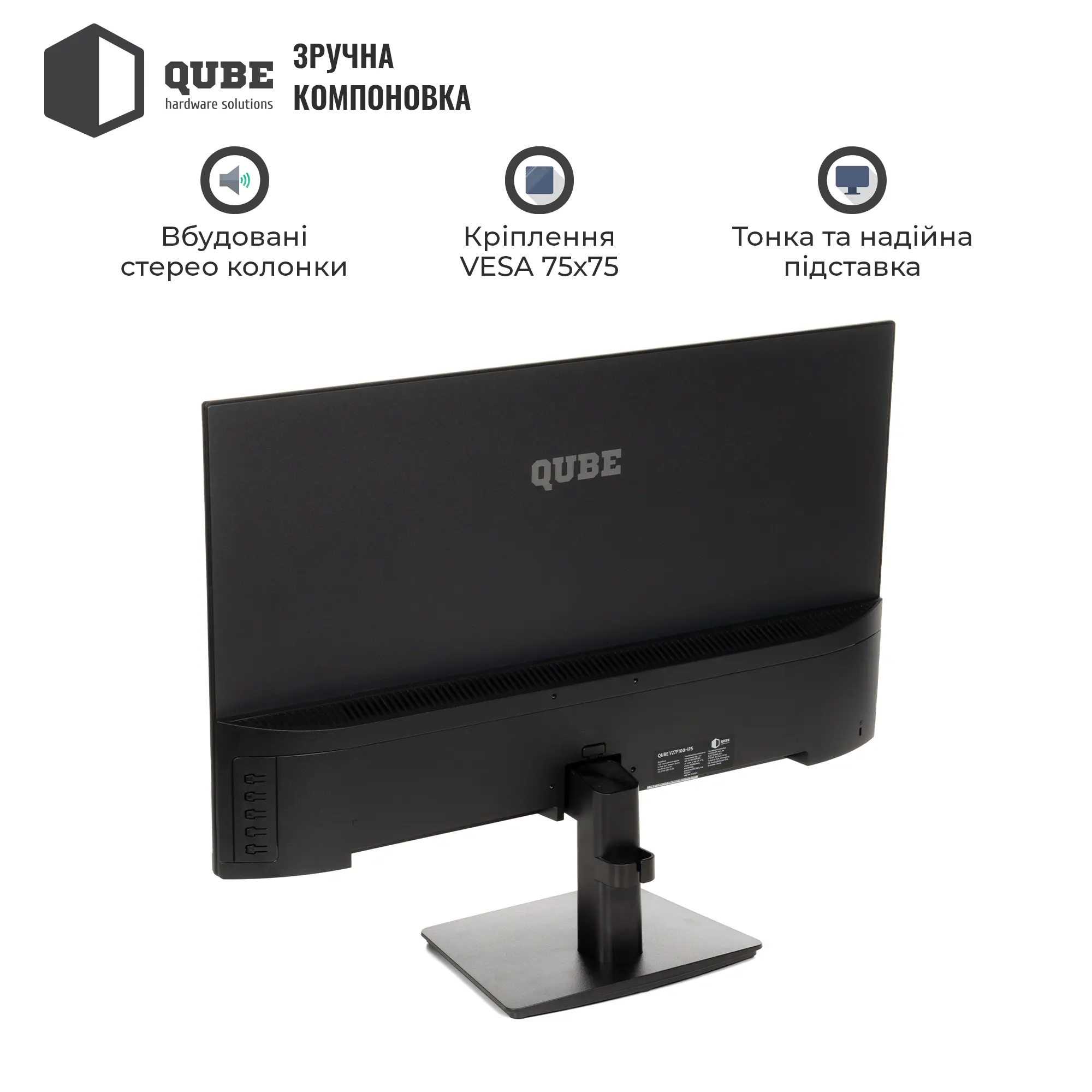 Монітор 27" QUBE V27F100-IPS має всі необхідні інтерфейси для зручного підключення до різних пристроїв. Роз'єми HDMI, DisplayPort і USB забезпечують широкі можливості для підключення як до комп'ютерів, так і до консолей або інших мультимедійних пристроїв. Це робить цей монітор універсальним інструментом як для роботи, так і для розваг.
