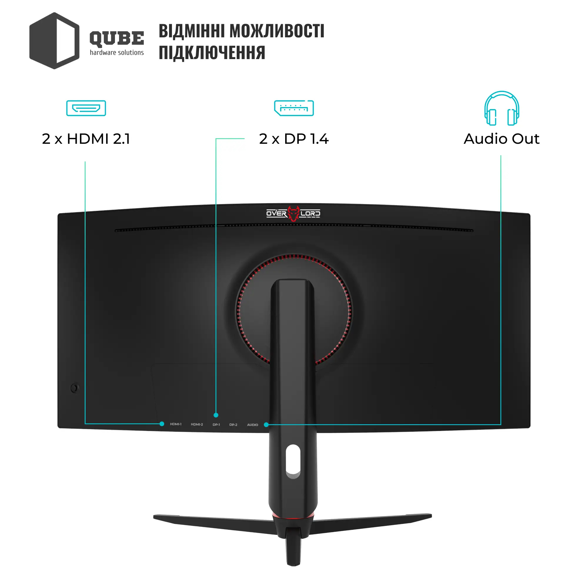 Qube Overlord C34UQ180H обладнаний сучасними інтерфейсами підключення: двома HDMI 2.1, двома DisplayPort 1.4 та аудіовиходом 3,5 мм. Вбудовані динаміки спрощують використання, позбавляючи від необхідності підключати зовнішню акустику. Елегантний чорний корпус із мінімалістичним дизайном гармонійно впишеться в ігровий чи робочий простір. Монітор 34" Qube Overlord C34UQ180H можна замовити в інтернет-магазині Artline – оптимальна ціна, стиль і функціональність роблять його універсальним рішенням для розваг і продуктивної роботи.