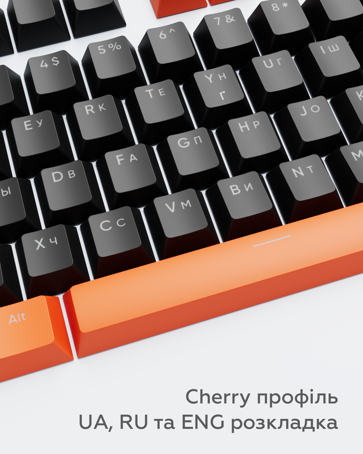 Зносостійкі кейкапи PBT з верхнім нанесенням ENG/RU/UA символів.