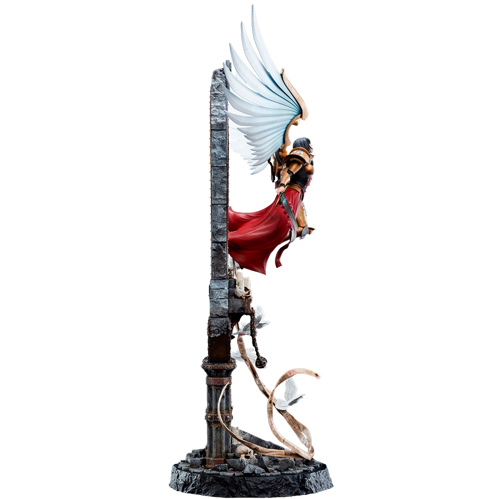 Сяюча золота броня виконана з вишуканою точністю, підкреслюючи її божественне походження, що різко контрастує з похмурими рештками війни внизу. Завдяки майстерному дизайну створюється ілюзія, ніби Целестина невагомо ширяє серед розбитої кладки, приносячи нову надію туди, де на камені викарбувано лише руйнування.